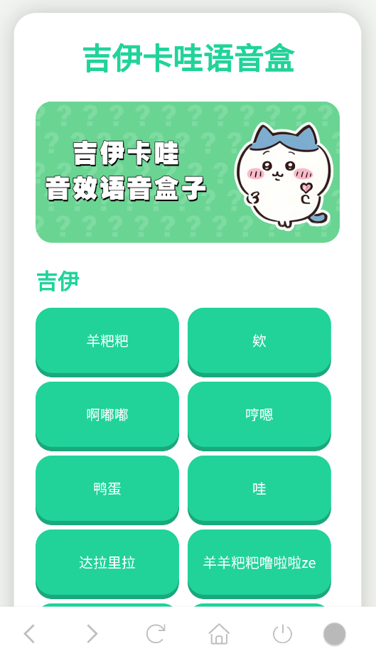 【吉伊卡哇语音盒】这是一款语音盒类型的软件,聚焦吉伊、小八、乌萨奇等角色,为角色内置了大量经典的语音和音效,全部从原始动画中提取。点击你最喜欢的语音栏播放它,你可以直接导入音频进行转换。你还可以自己录制声音,使这些声音也发生变化,恶搞你的朋友,并支持设置延迟播放、自动播放、循环播放等,让不同的玩家和用户在任何时候都能游玩这款游戏。