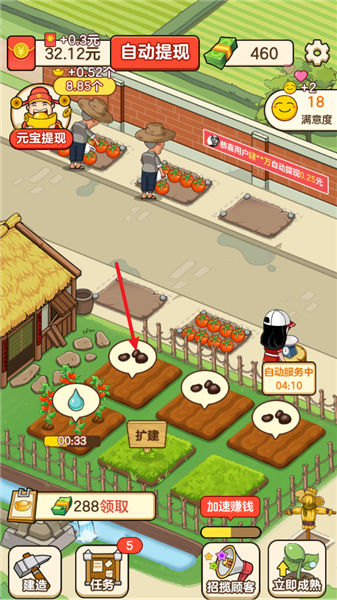 这款游戏的玩法非常有趣,玩家可以一边经营,一边获得自己喜欢的红包,自由的销售蔬菜,喜欢的快来试试看吧,而且还可以更换自己耕种的蔬菜等等哦。