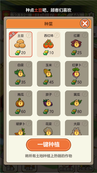 1.招揽客户,加速盈利,为农场的建设和扩张奠定坚实基础,实现蔬菜销售的成就感。