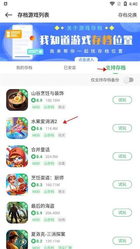2、然后找到支持存档分类,点击自己喜欢的游戏试玩;
