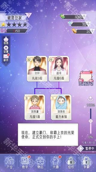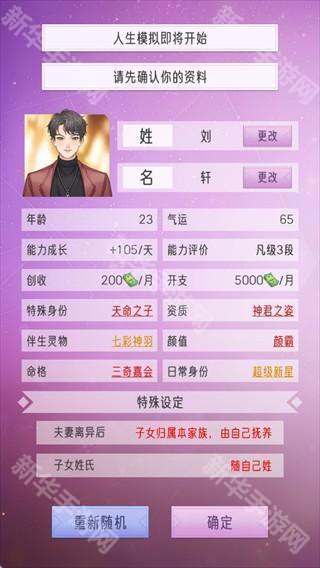 进入游戏后,先确认个人资料,包括姓名、年龄、气运、能力成长等属性,还可选择特殊身份、资质等设定,选好后点击【确定】正式开启游戏,你的使命是建立豪门、称霸上京、铸就百年荣光。