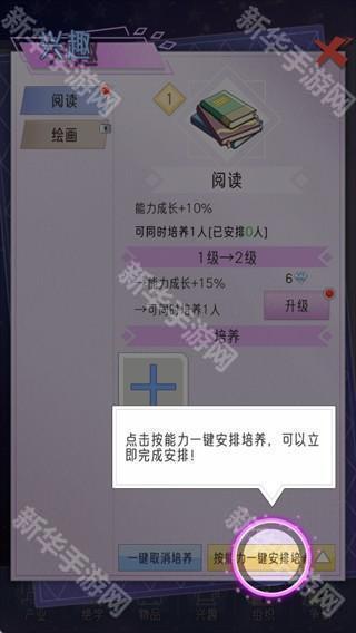 点击【兴趣】板块,可培养角色阅读、绘画等兴趣,能提升能力成长,可通过升级兴趣来提高加成效果,高效提升家族成员能力。