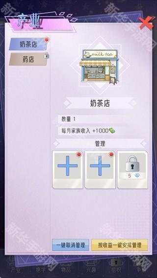 进入【产业】界面,可管理家族店铺,如奶茶店、药店等,可分配不同家族成员管理店铺,增加家族每月收入,也可通过钻石解锁更多管理席位,扩大产业规模。