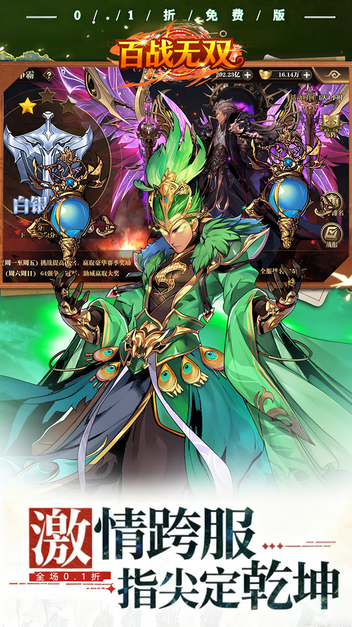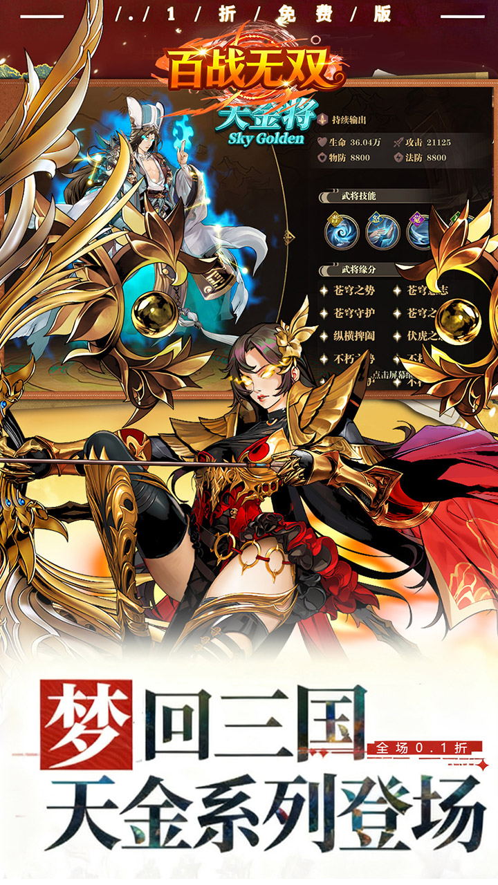 《百战无双(0.1折每天送1万代)》这是一款以三国为背景的纸牌修炼策略手机游戏。它具有创新的游戏机制,增强了游戏的乐趣。通过从著名将军那里收集卡片并组建强大的军团,玩家可以征服世界,征服城市和领土,玩家还可以体验到巨大的好处和丰富的活动,玩家可以通过抽卡来获得新的ssr角色,不断挂机培养让他们变得更加强大,每日登录领取代金券是免费的,来试试吧。