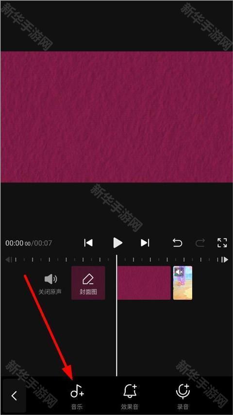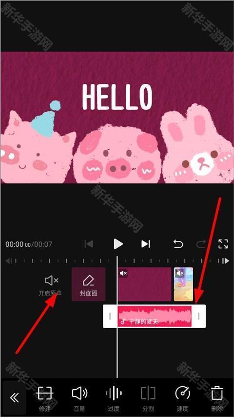 5、添加音乐后,关闭原声,拖动音乐进度条即可给整个视频添加音乐。