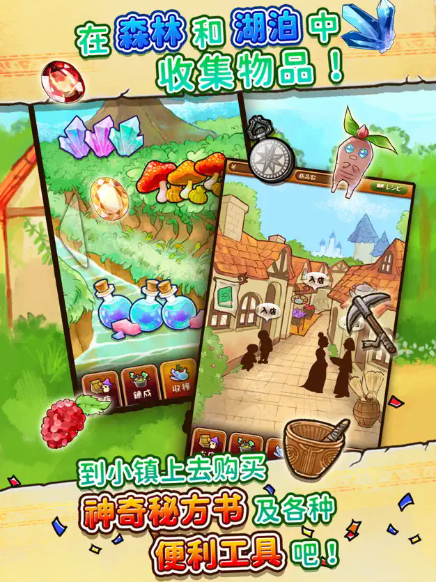 2.在森林和湖边收集材料,根据食谱准备杂货,并在购物街购买必要的材料。