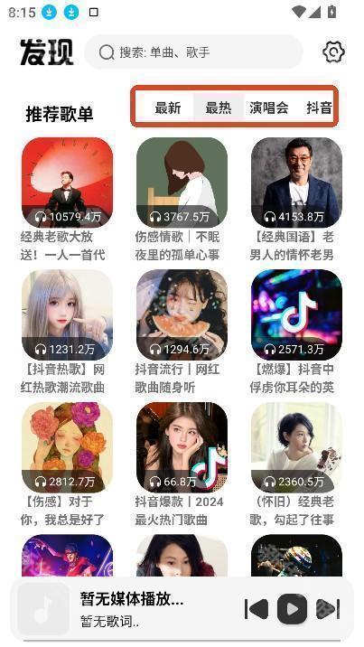 3、上方提供演唱会,抖音,最新,最热等栏目