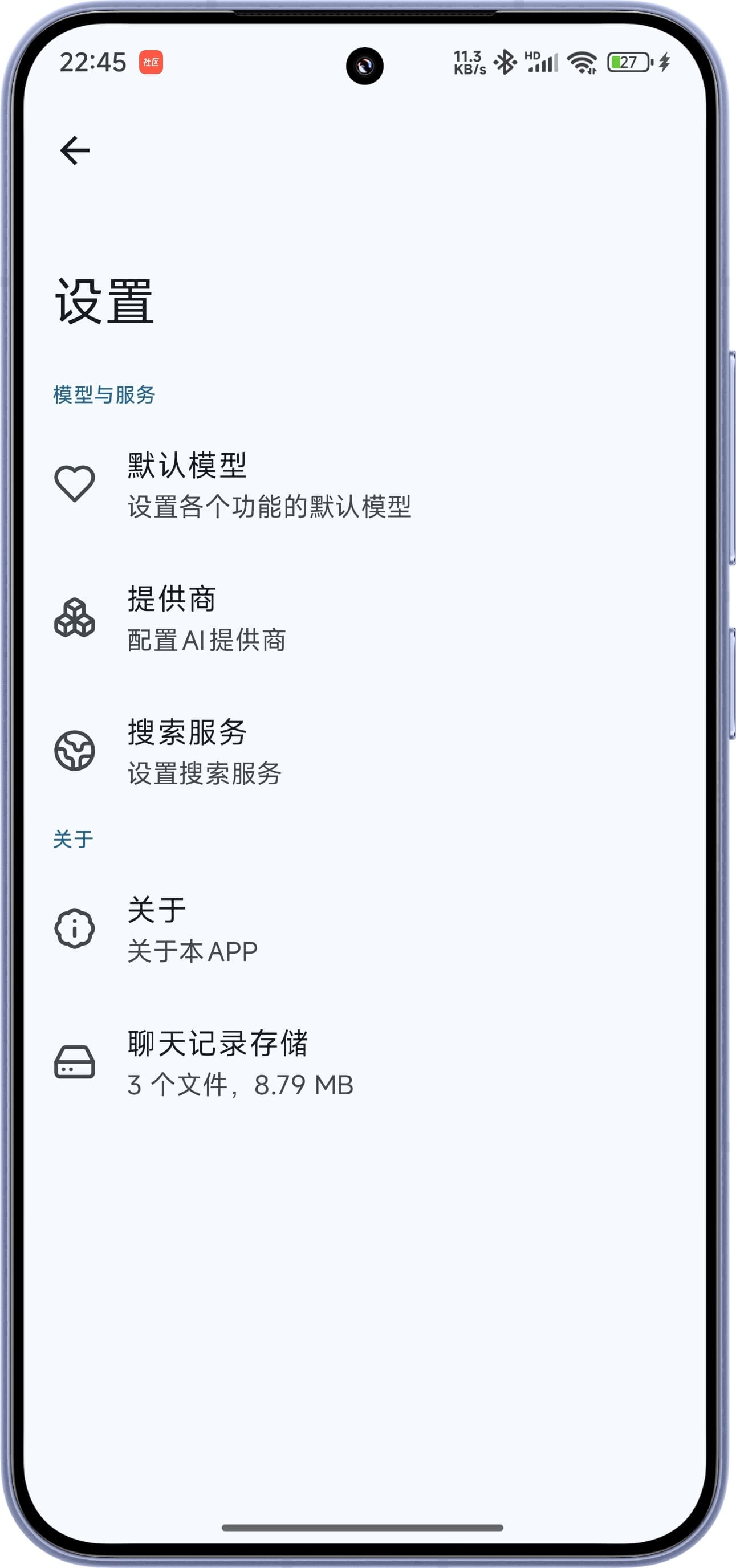 1、进入设置界面,找到搜索服务,可根据自身条件设置搜索提供商。目前已支持多个搜索服务商,如果需要完全免费,则选择Bing即可。