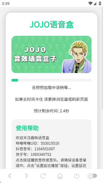 【JOJO语音盒】这是一款语音盒类型的软件,这款软件让玩家可以使用“JOJO的奇妙冒险”中的角色语音,提供在线播放和离线下载的双重模式,配备三种播放机制:单曲循环、循环播放和定时播放等等。所有语音包均免费提供,不受广告弹出窗口的干扰。支持语音拼接、变音等功能。用户可以自由组合不同颜色的语音片段,使对话变得有趣,这款软件为JOJO粉丝添加大量的互动乐趣。