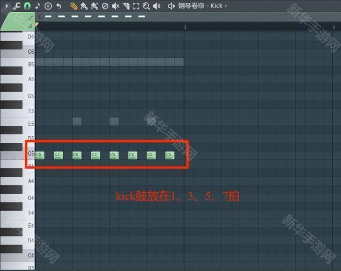 1、可以先从声部比较低的kick底鼓来编写,嘻哈音乐重视节奏感,而节奏感又主要通过鼓点来表达,所以在编写kick底鼓时可以编写在反拍位置,比如1、3、5、7拍,以此类推。