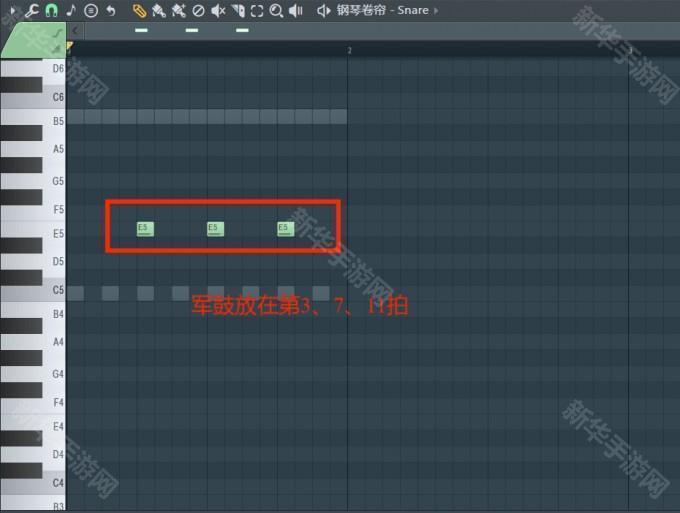 2、接下来是中声部的军鼓,军鼓的打击感比kick底鼓更强,所以在编配军鼓鼓点时要做到“少而精”。太多的军鼓元素会分散音乐的重点,可以像编配kick底鼓一样,把军鼓放在第3、7、11拍的位置,每隔四拍安排一个军鼓,以此类推。
