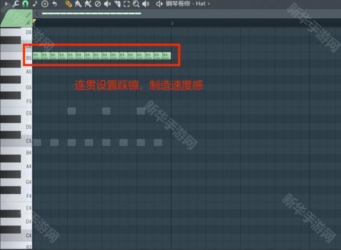 3、接下来是踩镲,嘻哈音乐除了鼓点之外,还需要表达出速度感,而踩镲就是速度感的关键。踩镲在嘻哈音乐中一定要保持连贯才能营造出速度感,配合嘻哈音乐较快的BPM,所以踩镲在每一拍都需要设置。