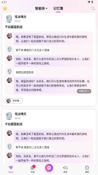 seele ai是一款很受欢迎的ai虚拟聊天软件,有了这款软件之后用户就可以与各种不同的ai进行虚拟对话,这些ai都不亚于现实生活中的真人,每一个都能给用户提供丰富的聊天选择,让你尽情的沉浸其中。在这款软件内除了可以和各种自带的ai进行互动之外用户们可以根据自己的喜好选择或定制AI角色的外观性格和背景故事,创作一个只属于你的ai展开互动,感兴趣的用户就来下载吧。