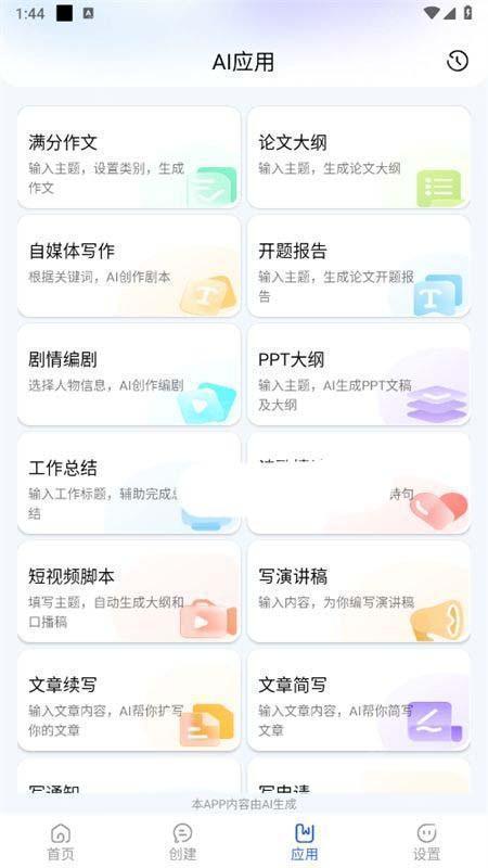 4、在应用页面,为大家提供了自媒体写作、论文大纲、文章续写等AI功能