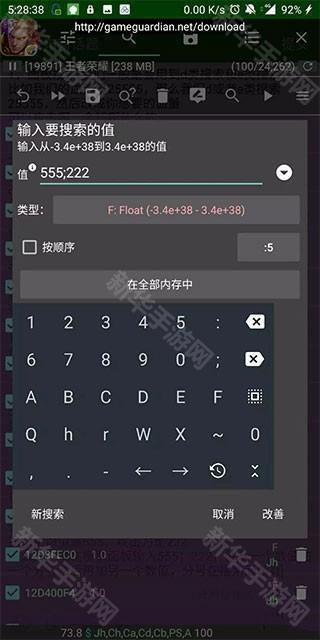 当我们需要搜索两个数据的时候,一个一个搜索起来的话数值会很多,容易奔溃,那么我们就可以用到联合搜索,比如生命值是555,攻击力是222,那么我们就在搜索面板输入555;222,就是一个数值加一个分号然后再加另一个数值,分号在搜索面板有。
