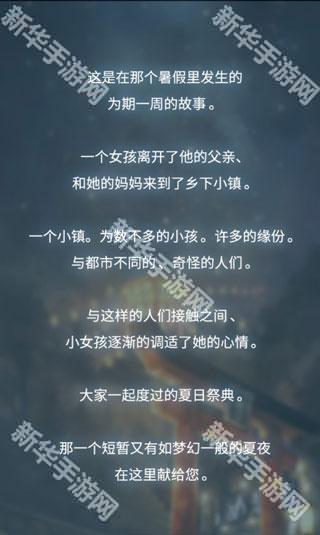 游戏讲述了一个温馨美好的回忆。故事发生在昭和时代日本的一个小村庄,一个放了暑假的小女孩从城里过来度过她的暑假。在这里,她度过了一次盛夏祭典,这里有烟花,也有捞金鱼的摊位,还和许多人成为了朋友,这是她一生最难忘的暑假。剧情十分简单,没有令人惊叹的设定,只有每个日本人都经历过的夏日祭风景,只有单纯与美好相伴。