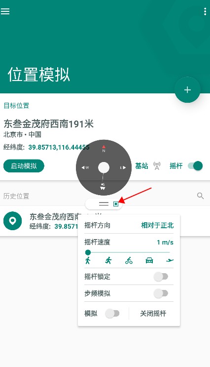 4、点一下指南针下方的图标,可以调出控制摇杆的指标,如摇杆方向、摇杆速度等。