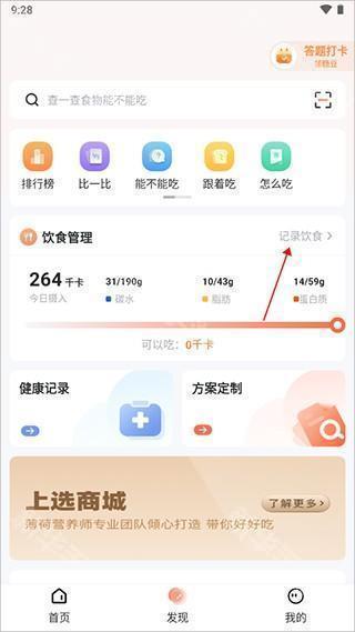 1、打开薄荷营养师,以登录应用后,在发现页面中点击记录饮食的选项。