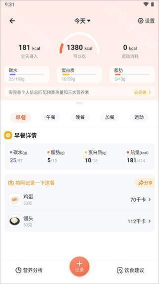 1.支持食物的照片识别、手动输入或搜索添加的膳食以及自动计算卡路里。