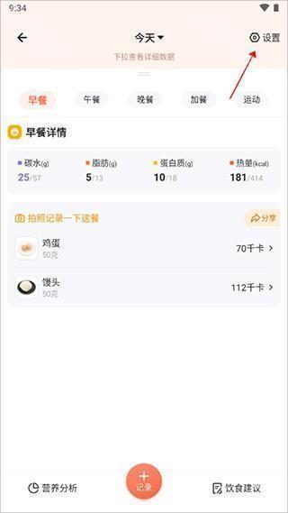 1、可以进入发现页面中点击记录饮食,然后在打开的页面中点击右上角的设置选项。