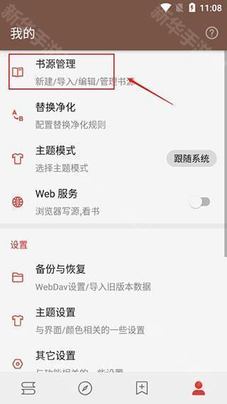 1、在本站下载打开开源阅读,点击我的,进入书源管理界面;