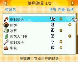 游戏中有很多道具,可以增加作物的各种参数,其中有些特定的道具就可以提高特定作物的产量。例如铜制锄头、牛凤、银制叉子等可以提高草莓的产量、银制锄头可以提高洋葱的产量等等。