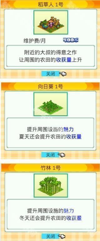 除了道具外,建设适当的环境设施也可以提高作物产量。稻草人就在提升产量上十分有效。此外,还有些环境设施会根据季节来对产量进行加成,如竹林可以提高冬天的收成、向日葵可以提高夏天的收成等等。