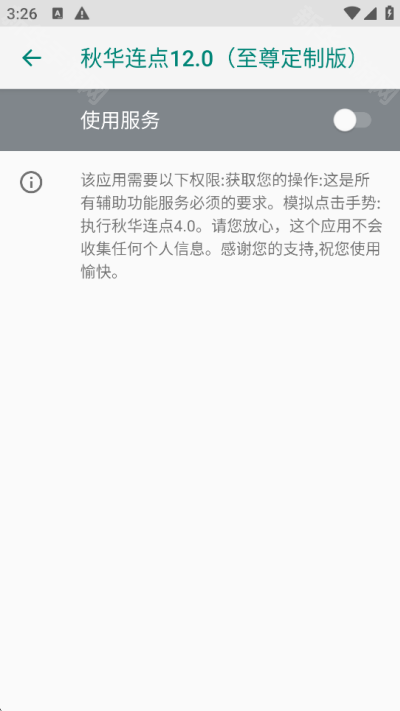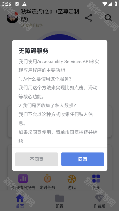 【秋华连点12.0豪华至尊版】这是一款连点器类型的软件,这个版本不仅仅是最新版,并且是豪华至尊版,旨在模拟手动点击和滑动操作,自定义和控制点击位置,解放双手,无需root,只需启用可访问的服务,保护用户手机系统的安全,还具有其他不同的内置功能,以满足用户的不同使用需求。此外,该软件使用非常自由,并强制将图像质量提高到120刷新率,使用方便快捷。