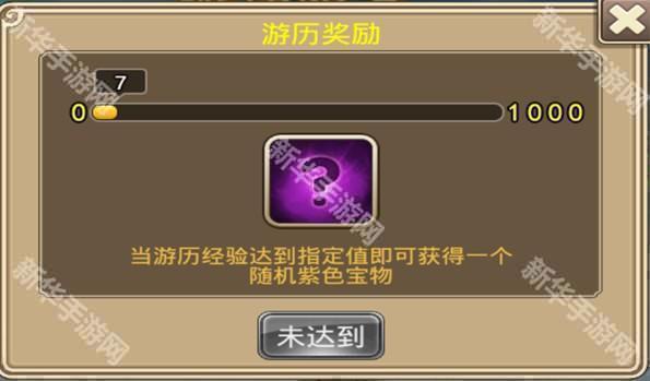 3、玩家累计点数每当达到1000点的时候,即可以领取游历奖励,可以随机获得一个紫色宝物。