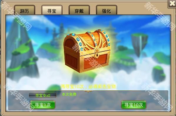 4、寻宝:分寻宝1次和寻宝10次,寻宝会消耗寻宝令,或者可以消耗250元宝,而且每48个小时会免费给玩家寻宝一次,寻宝10次后必得紫色宝物。寻宝10次是方便玩家多次寻宝,快速找到自己需要神兵和法宝
