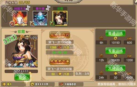 推图闯关所得经验只提升主角等级,仙将的等级需要单独进行训练。仙将的训练可分为:普通训练、专家训练、大师训练,游戏内各有说明。如果想快速提升仙将的等级,可以使用仙功突飞和元宝突飞。