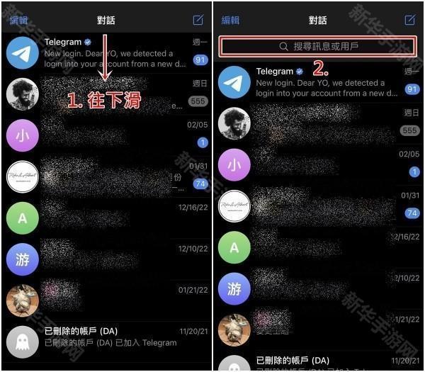 1、在app主页「往下滑」,就会显示「搜索消息或用户」的栏位,请点一下它。