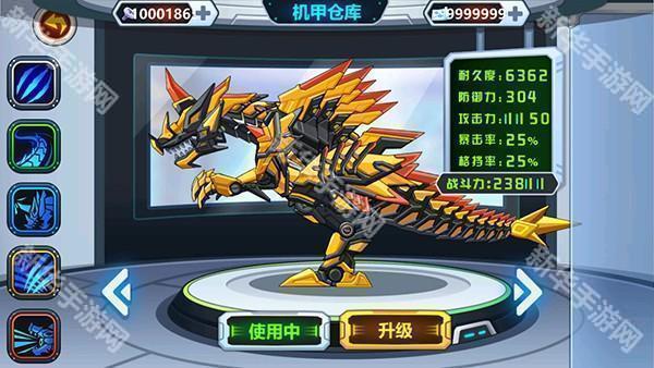 2、将右边机甲配件拖动到恐龙身上,并升级它们的装备提升战力。