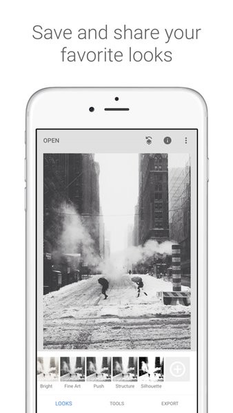 1、简洁直观:小树叶Snapseed软件以简洁直观的界面设计,让用户轻松上手,无需繁琐的学习过程,即可进行修图操作。