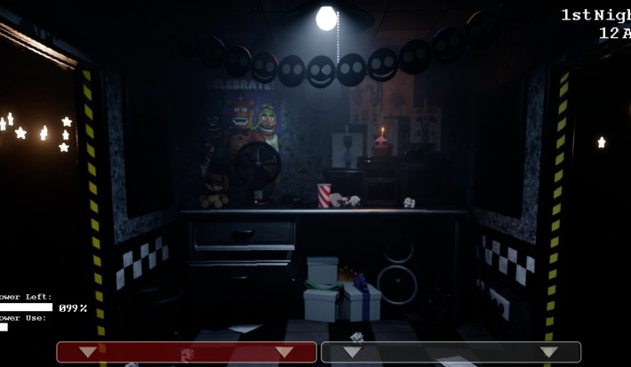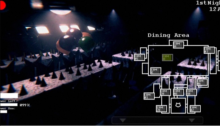 邦尼奇卡最初在cam1A的房间里,最终分别到达左门(邦尼)和右门(奇卡),机制较为单一,在左右门开灯看见它们时,关上门防御