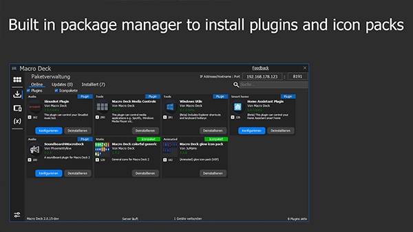 macro deck是一款很好用的插件工具软件,通过这款软件可以将手机、平板电脑或浏览器设备转换为远程宏键盘的软件,让你不用来回切换屏幕更省心,除此之外还可以用这款软件来执行单步或多步操作,将你的智能手机变得更加智能,使用也更加简单丰富,更好的完成控制和自动化您的流媒体、游戏、智能家居,对这款软件有需要的用户就来本站下载体验吧。