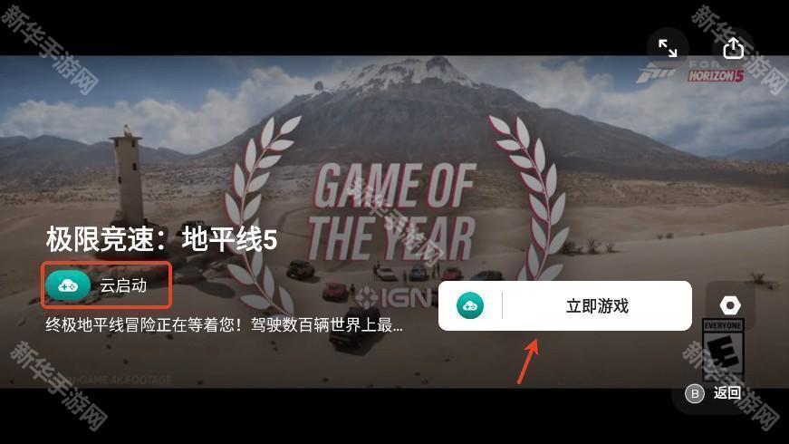 7、在首页,选择支持云启动的游戏,如极限竞速:地平线5,点击"立即游戏";