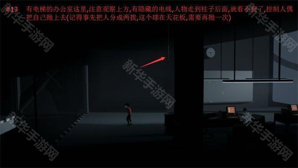 13、有电梯的办公室这里,注意观察上浮,有隐藏的电线,任务走到柱子后面就看不到了,控制人偶把自己抛上去,记得事先把人分成两拨,这个球在天花板,需要再抛一次
