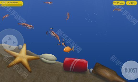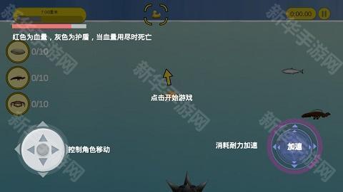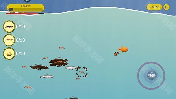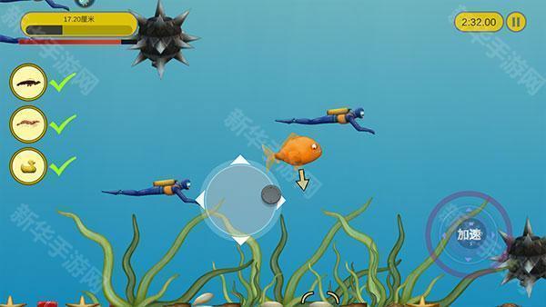 2、游戏中的控制采用虚拟摇杆操作方式,左边为控制小鱼的移动,游遍为耐力加速,点击即可获得加速效果。