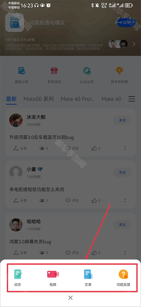 3、然后在下方动态、视频、文章、问题反馈中选择一个你喜欢的方式进行发布