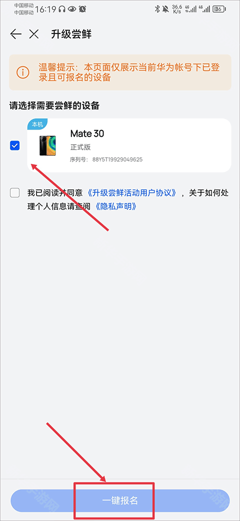 4、然后在升级尝鲜界面中选择需要尝鲜的设备,并点击一键报名