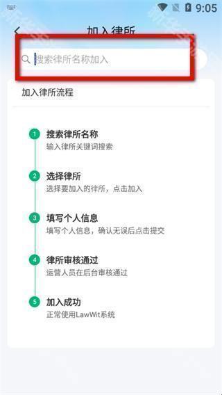 4、在加入律所页面,搜索律所名称,按流程选择律所、填写信息,待审核通过后即可加入成功。