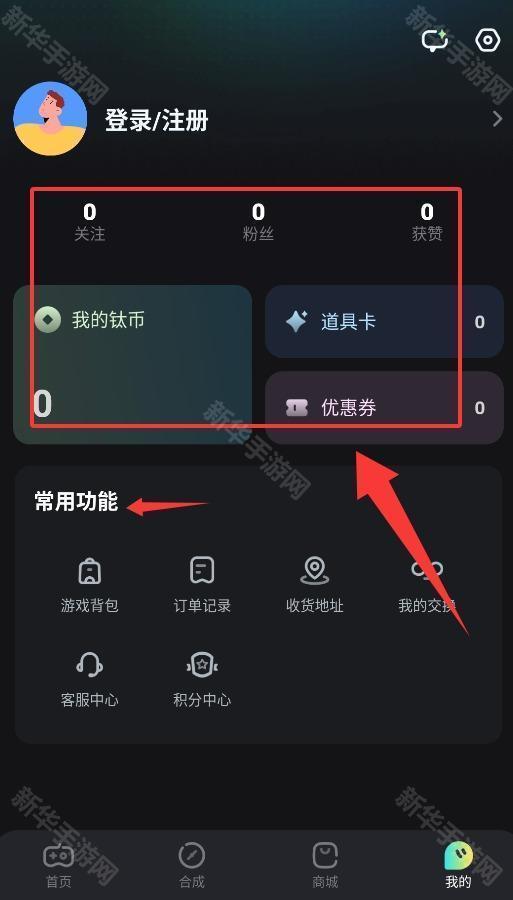 4、个人中心可查看社交数据、虚拟资产及常用功能,包括关注、粉丝、获赞、钛币、道具卡、优惠券等。