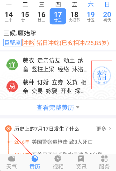1、选择并切换到【黄历】这个板块界面,点击右边的“查询吉日”功能按钮。