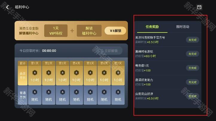 2、通过完成右侧的任务或者签到可以免费获得时长