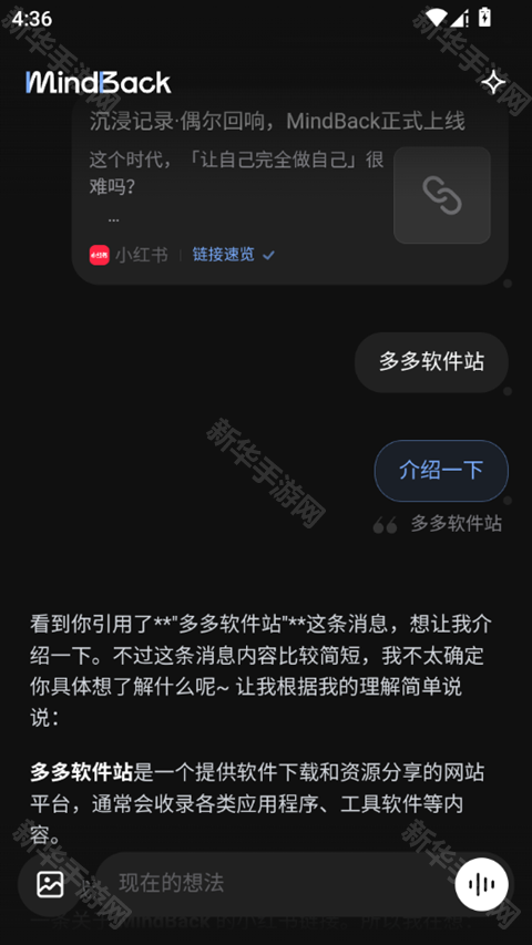 3、在其他App(如小红书、公众号、大众点评、知乎、小宇宙、B站)看到好内容?直接通过"系统分享"投递给MindBack,顺便附上你的随想,MindBack会自动生成链接解析,让收藏不再是单纯的堆积,而是知识的即刻消化。