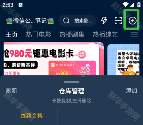 1、在影视仓手机版App主界面点击右上角加号标识。