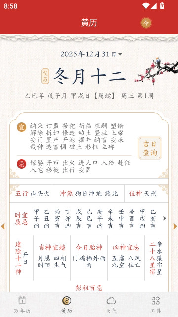 今日宜忌、黄历宜忌、吉日查询、五行冲煞、建除十二神、二十八星宿,一目了然!