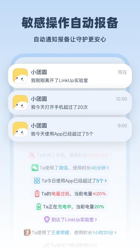 支持位置移动通知以及手机使用通知,从而能够全面守护对方的出行安全;