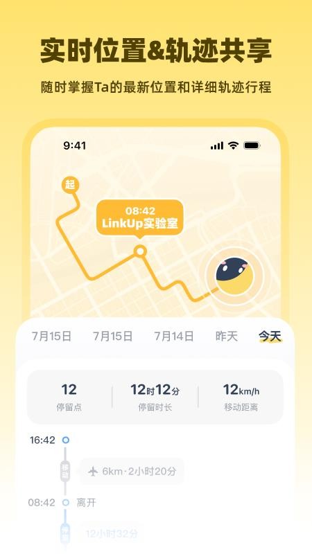 全天候追踪Ta的行程足迹和出行方式,速度与停留时间尽在掌握,可查询最近15天记录,让关心和守护时刻在线~